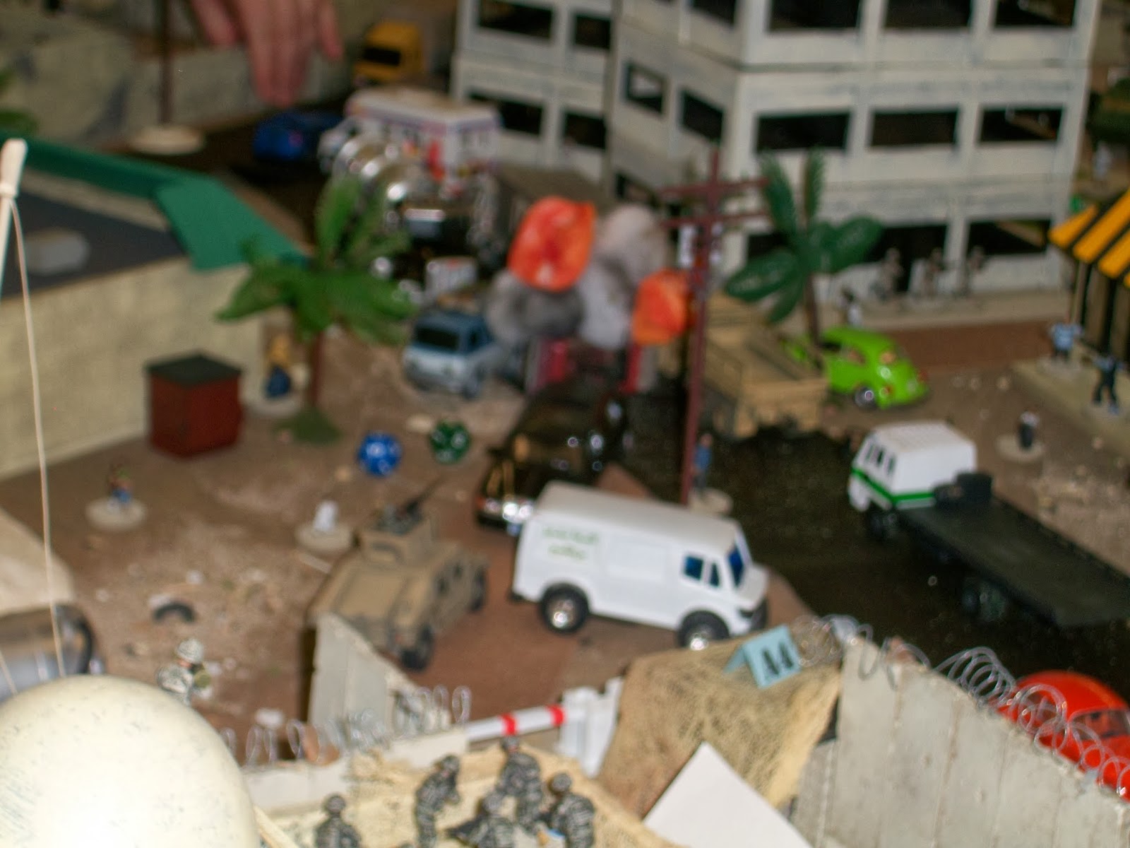 The Iraq game particularly was fun and had an interesting move sequence that kept all the players pretty much heavily involved While one patrol took heavy damage and had to be reinforced by Navy Seals - The second squad was more successful assisting Iraq military in suppressing insurgents in a 5 story apartment building. The death of the American commander in the American compound delayed an adequate response to an Elite unit of insurgents that popped up on the freeway mortared the compound and attacks from the insurgent supported Mosque. A predator drone and gun ship were two turns away from delivering a killing blow to these arrogant insurgents - who were so brazen as to have lured a naïve CNN reporter for an interview on top of the Mosque as snipers shot and killed American peacekeepers and UN support mission personnel